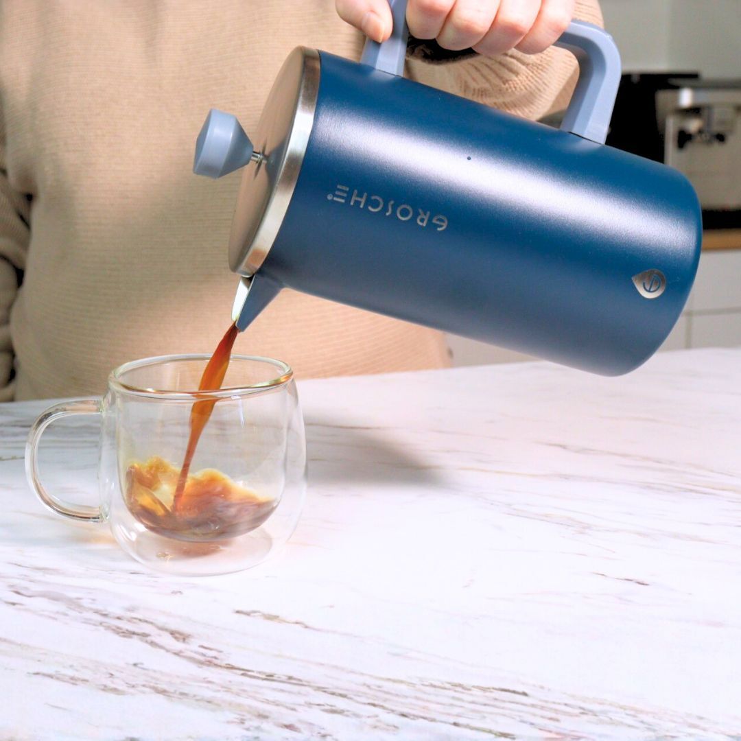 This stainless steel French press also includes a dual mesh coffee filter to prevent majority of grit from getting into your coffee.